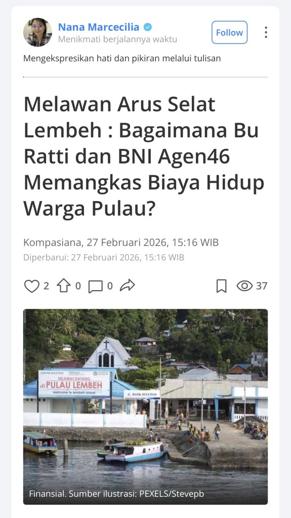Kembali dipercaya menjadi Exclusive Writer di Kompasiana tentang keterlibatan BNI dalam memberikan kemudahan akses bagi warga di Pulau Lembeh memberikan tantangan tersendiri.