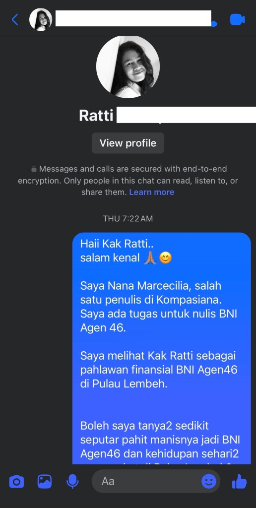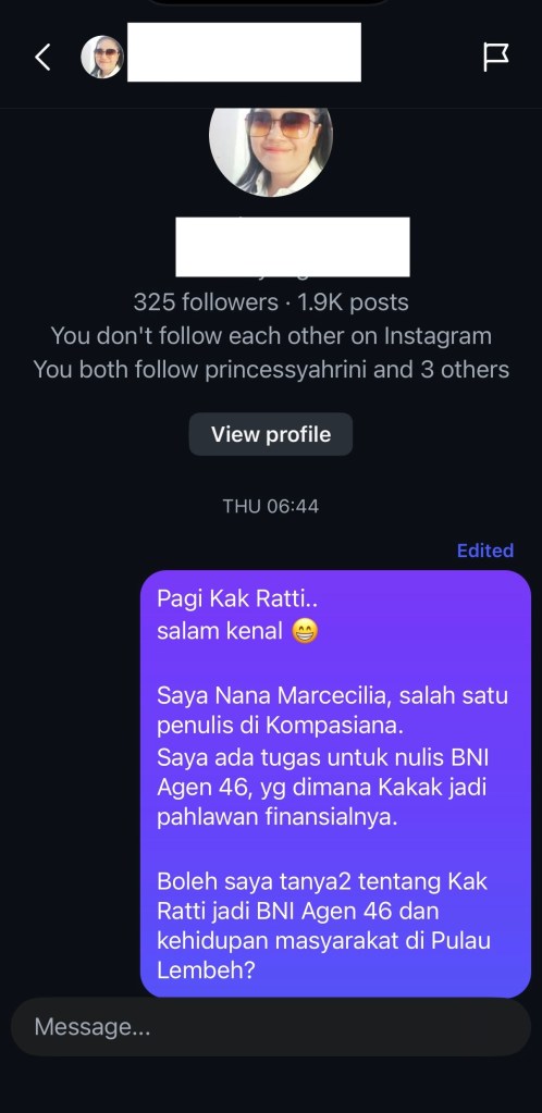 Pukul 06.44 pagi, saya memberanikan diri untuk menghubungi Bu Ratti via akun Instagram. Kemudian pukul 07.22, berusaha menghubungi beliau di Facebook, karena saya perhatikan beliau lebih aktif di Facebook.